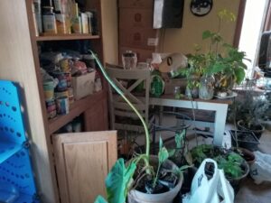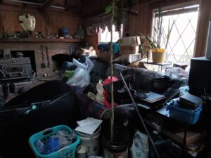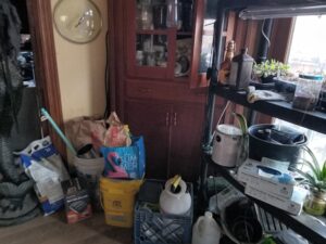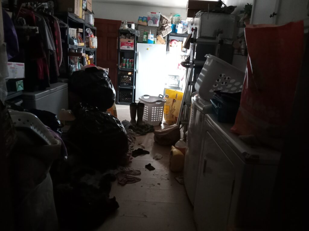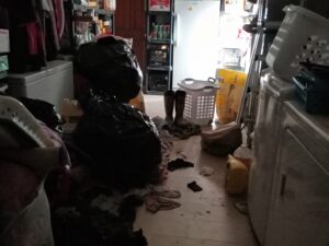 The deck was not the only area filled with garbage and clutter. The photo at left shows a the laundry room impassable to my new wheelchair accessibility challenges. A hoarder has every right, to live in filth. A landlord who rents rooms does not. In exchange for rent, a landlord must provide a safe safe home environment. Anything short is exploitation. In common terms, renting out a room when the common areas are unsafe is called being a slum lord. This is not opinion. It is established law and it is codified. I’ve been in a wheel chair with one fully working arm for over over two years for renting from a slum lord. Wheelchair bound or not, tenants have a right to access what they rented.